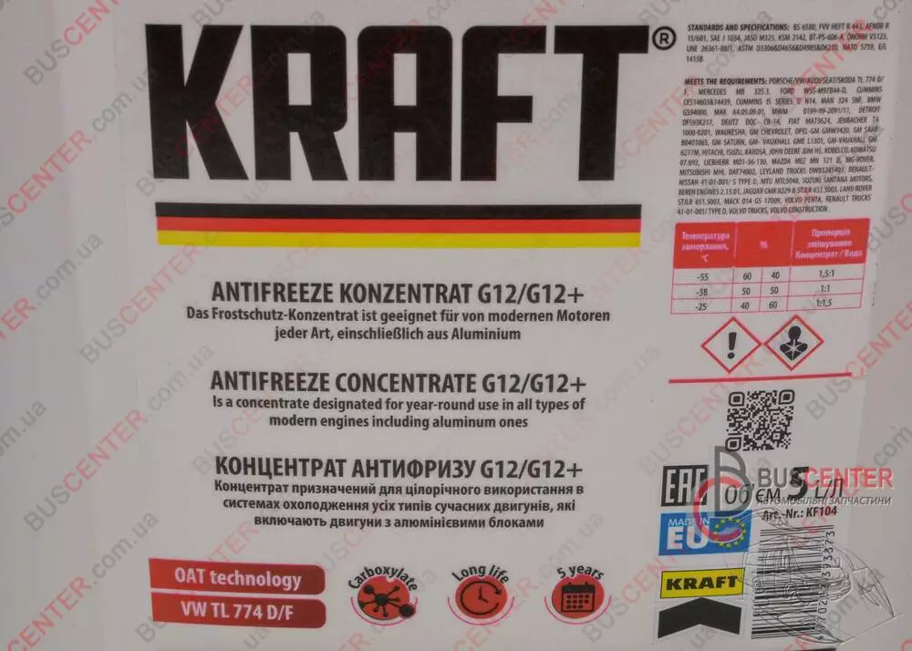Антифриз -55°C 5 л концентрат G12/ G12+ (тосол - красный G12/ G12+) Fiat Ducato 1 940 650 KF104