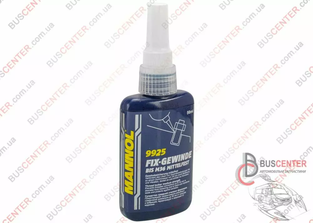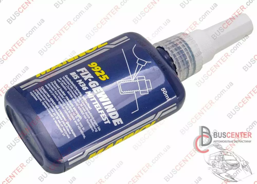 Fix-Gewinde Mittelfest 9924/9925 – засіб для фіксації всіх типів різьблення (середньої фіксації): болтів, гайок, шпильок, шурупів і т.д. Запобігає самовідгвинчуванню кріплення через підвищені навантаження та вібрацію. Підходить для будь-яких різьбових з'єднань у всіх вузлах автомобілів, мототехніки, комерційної техніки, а також у промисловості та побуті. Може використовуватися для герметизації різьблення та вузьких зазорів, а також як антикорозійний засіб. Властивості: - запобігає розхитування та міцно фіксує металеві різьбові з'єднання діаметром до M36 включно; - Витримує сильні навантаження та вібрації: застосовується в двигунах, трансмісіях, коробках передач; - повністю заповнює зазори різьблення, герметизує її, запобігаючи протіканню через неї масла, води, палива, технічних рідин і повітря, а також корозію; - підходить для фіксації підшипників, опорних болтів, штифтів та заглушок; - Для різьблення М10 витримує момент, що крутить, до 20 Н·м; - Робочий діапазон температур від -55 ° C до + 150 ° C; - застосовується на замаслених поверхнях та на різьбленнях з гальванічними покриттями; Застосування: Нанесіть рівномірно засіб на гвинт і гайку. З'єднання фіксується через 10-20 хвилин, повністю застигає через 1-3 години. Затвердіння відбувається при недостатньому надходженні повітря (засіб анаеробний).