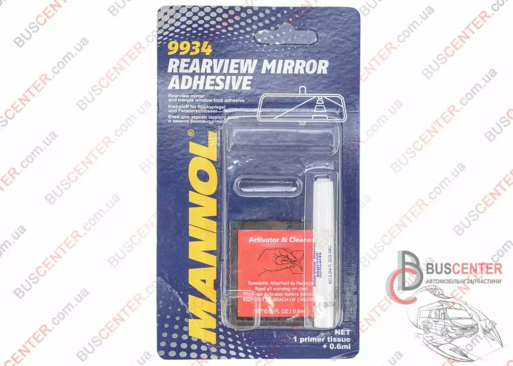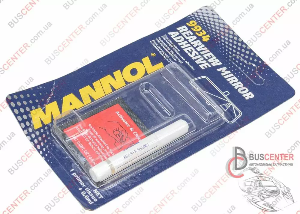 Rearview Mirror Adhesive – разработанный специально для приклеивания металлических пластин креплений зеркал заднего вида («пятачков») к лобовому стеклу, а также для приклеивания различных металлических деталей (шарниров, запоров, крепежных элементов и т.п.) к боковым стеклам и форточкам автомобиля. Вместе с тем подходит и для склеивания любых металлических и пластиковых деталей в быту. Незаменим и эффективен для планового и аварийного ремонта, модернизации и внутренней обработки транспортных средств, плавсредств, мотоциклов, спортивного инвентаря, бытовой техники. Может использоваться для приклеивания антенн и накладок к кузову. Свойства: - высокостабильный - устойчив к высоким нагрузкам, вибрации, сильным перепадам температур и воздействию ультрафиолетового излучения; - пригодный для крепления пластин крепления или ножек (кронштейнов) зеркал любых типоразмеров и материалов; - быстро затвердевает и хорошо держится; - отлично компенсирует разницу в тепловом расширении склеенных материалов. Применение: Снимите зеркало с крепежной пластины, если это предполагает конструкция. Отметьте исходное положение пластины/ножки (кронштейна) на внешней стороне ветрового стекла. Тщательно очистите склеиваемые поверхности от остатков клея, загрязнений, жировых и масляных отложений. Для обезжиривания рекомендуется использовать 9691 MANNOL Brake Cleaner. Аккуратно распакуйте салфетку с активатором-очистителем (activator&cleaner). Старайтесь не прикасаться к салфетке, используйте для этого упаковку как чехол, как это указано на упаковке салфетки. Протрите ей ту площадь стекла, которая соприкасается с крепежной пластиной/ножкой (кронштейном) зеркала. Саму пластину/ножку (кронштейн) протирать не следует. Дайте активатору высохнуть в течение 1-2 минут. Нанесите только одну крупную каплю клея внутрь пластины/ножки (кронштейна), не распределяйте по поверхности. Крепко прижмите и удерживайте 1-2 минуты, пока клей не затвердеет. Подождите 15 минут, прежде чем установить зеркало на крепежную пластину.