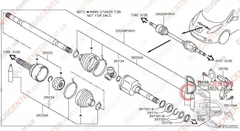 Полуось правая 27/29 (в сборе, с гранатами) Nissan Leaf 391003NF2A 39100-3NF2A