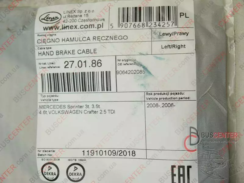 Трос ручного тормоза задние диски (задний) Mercedes Sprinter A9064202085 27.01.86